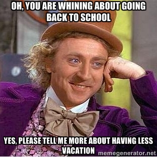 What I hate about back to school time is all the whiners bitching about waking up early, resuming their teaching jobs, and rejoining society.